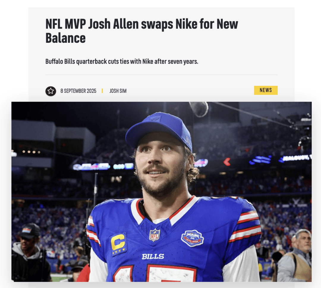 近日,NFL明星四分卫、上赛季MVP约什·阿伦已离开耐克,与New Balance签订代言协议。New Balance近期迅速扩充运动员阵容,旗下还拥有网球名将科科·高芙、棒球巨星大谷翔平及WNBA球星卡梅伦·布林克等明星代言人。品牌声明称:“随着New Balance橄榄球家族不断壮大,我们荣幸迎来约什·艾伦加入赛场与社区,共同开启新篇章。”