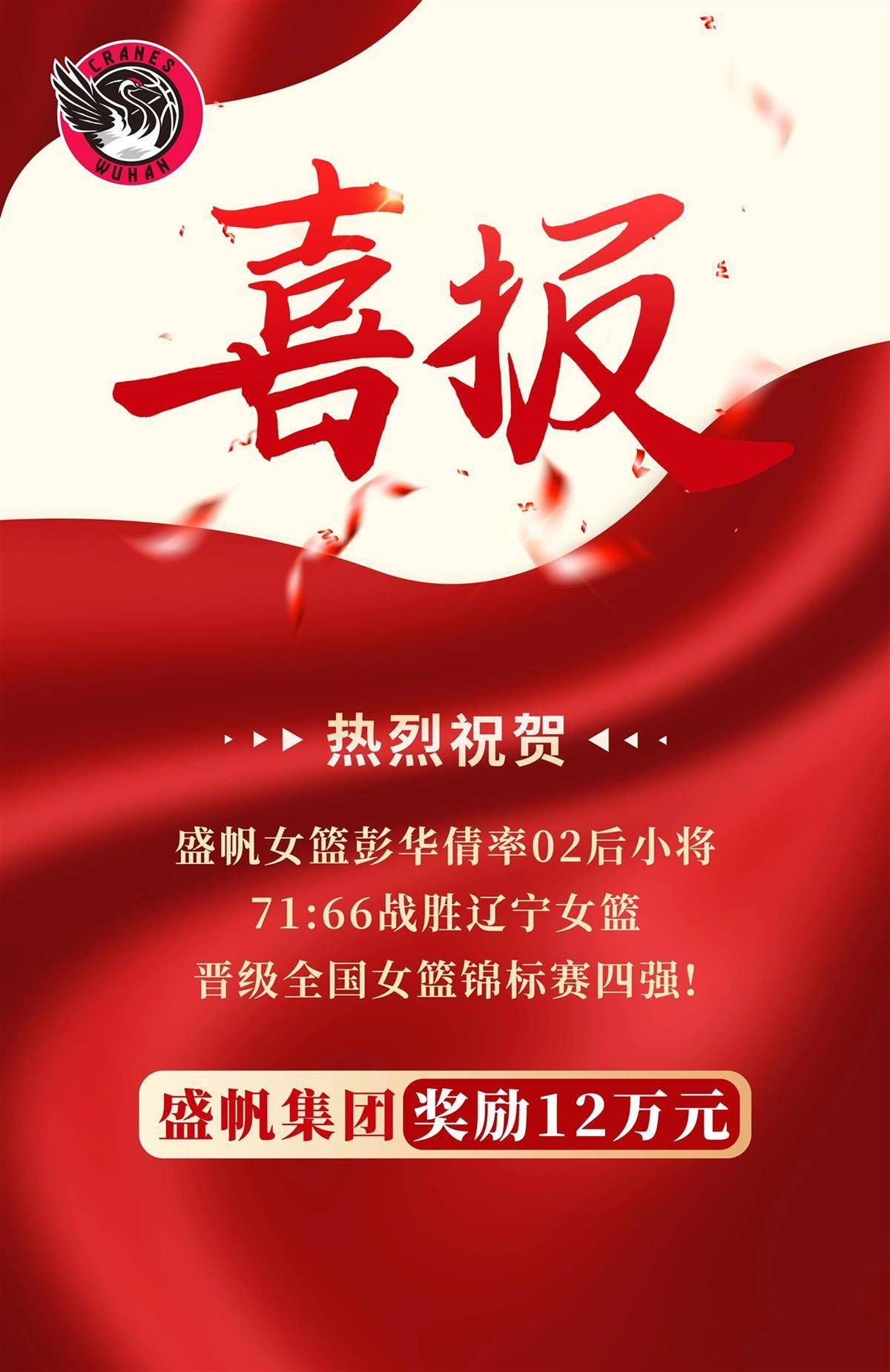赢得本场比赛的武汉盛帆黄鹤女篮成功晋级半决赛,位列四强的成绩也追平了球队在全国锦标赛上的历史最佳战绩。赛后,盛帆集团决定奖励盛帆女篮12万元,以表彰她们的出色表现。根据赛程安排,武汉盛帆黄鹤女篮将在10月16日晚7点半,在赛事半决赛中,对阵四川远达美乐女篮,争夺决赛资格。