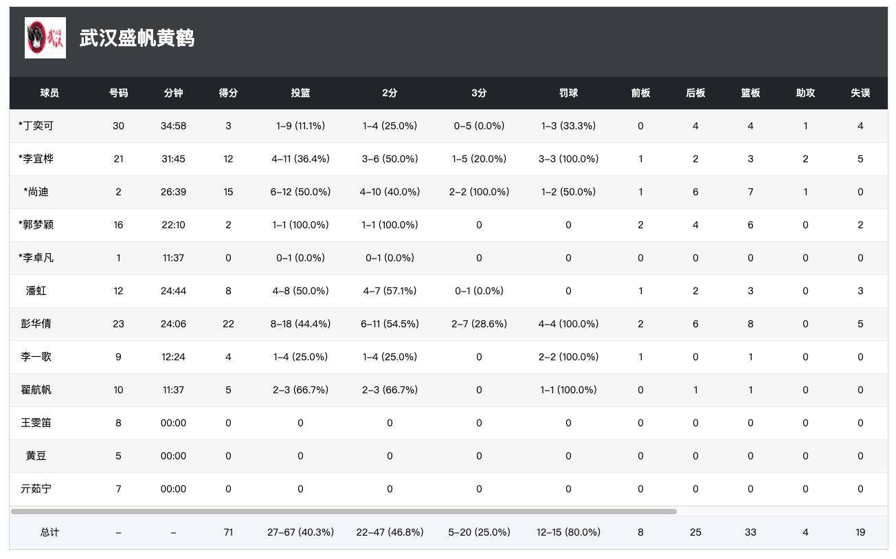 最后时刻,彭华倩再次立功,她两次突破上篮得手,随后又利用造犯规的机会,稳稳两罚两中,为球队彻底锁定了胜局。最终,武汉盛帆黄鹤女篮以71比66战胜辽宁女篮。赛后数据显示,在本场比赛中,武汉盛帆黄鹤女篮的彭华倩砍下全场最高的22分,另有8篮板。尚迪15分7篮板,李宜桦得到12分。