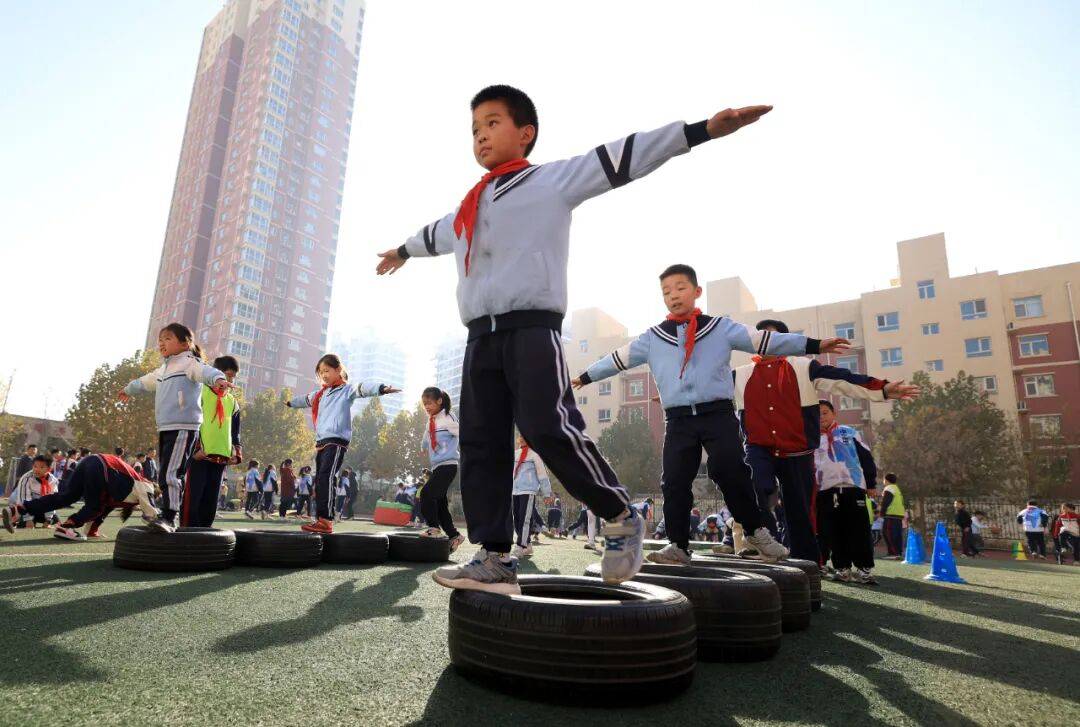 在石家庄市仁华小学,大课间的时间一到,操场便被巧妙地划分为多个功能区,变身为一座充满挑战的“运动乐园”。低年级的孩子们在垫子上匍匐前行,锻炼身体协调性;中年级的学生轮流跨越“坦克墩”,挑战平衡能力;高年级的学生则勇敢地进行支撑分腿腾跃,展现力量与技巧。学校精心设计了超过80个运动项目,并根据学生年龄特点分层设置,确保每个孩子都能找到适合自己的运动,在“玩”中得到全面锻炼。副校长安莎介绍,这种设计的目的在于让孩子们在运动中有练习、有挑战、有进阶,还能在运动过程中实现自我超越。