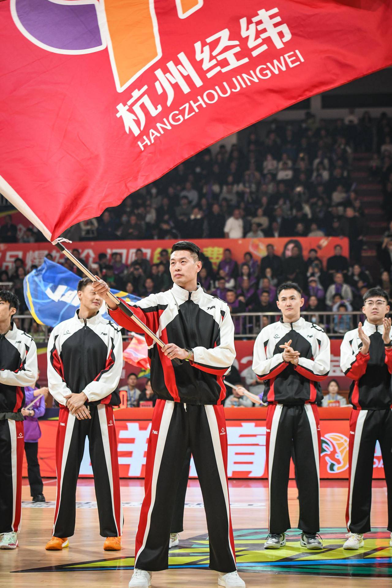 在富阳队对嘉兴队的比赛间歇,杭州经纬男篮的主帅接过球队的队旗,球员们也都来到场地中央,在球队队旗下方集结。