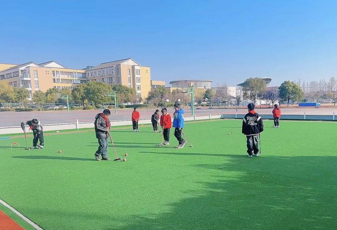 特色门球操将握杆、击球等专业动作融入韵律舞动,节奏明快、刚柔并济。课后延时服务以“分层教学+趣味互动”为核心,低年级开展“门球闯关大冒险”,中高年级聚焦专业技能训练,通过一对一纠错、小组PK等形式夯实基础。