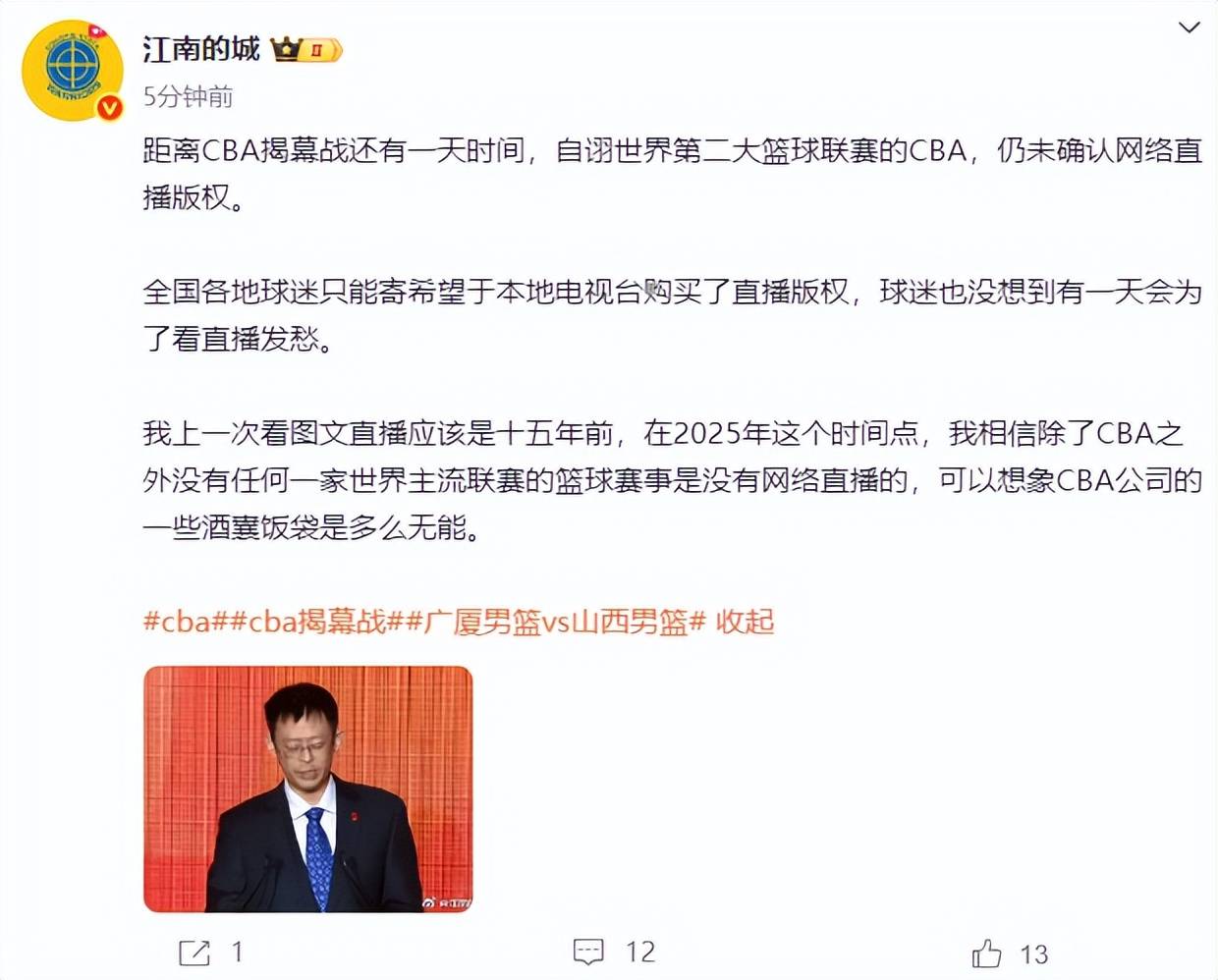 有媒体人士批评CBA管理层是一群酒囊饭袋。有评论指出:我上一次看图文直播已经是十五年前了。现在是2025年,除了CBA,应该没有其他主流篮球联赛没有网络直播了。可以想象,CBA的一些领导人是多么无能。相比之下,NBA的市场价值巨大,转播费用也非常高,像腾讯和咪咕这样的公司愿意投入巨额资金购买转播权,因为NBA吸引了大量观众,球迷愿意观看。而CBA的市场影响力较小,球迷数量也有限,转播商无法从中获得足够的收益,因此不愿意支付高额费用购买转播权。