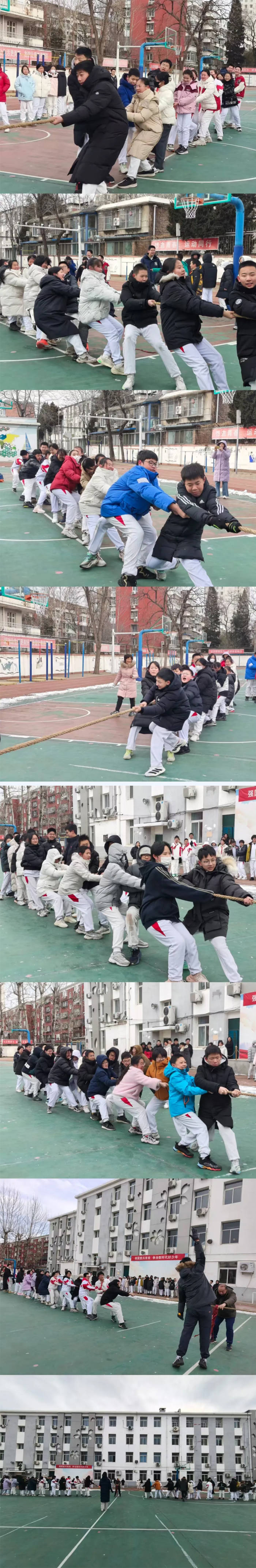 1月19日,中学田径场上呐喊震天。初一年级拔河比赛以班级对抗与班组联谊相结合,同学们紧握长绳、齐心后拉,生动诠释了团结就是力量。初二年级则通过抽签循环积分赛展开较量,每一场都是意志与协作的双重考验。