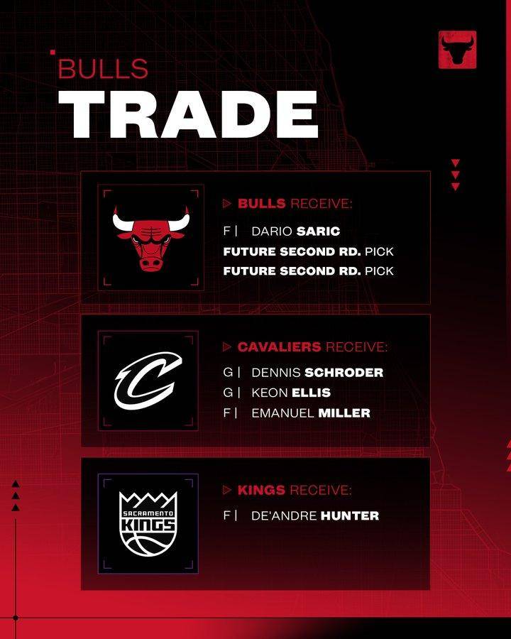 芝加哥公牛队获得: 达里奥-萨里奇、2027年次轮选秀权以及2029年次轮选秀权。
