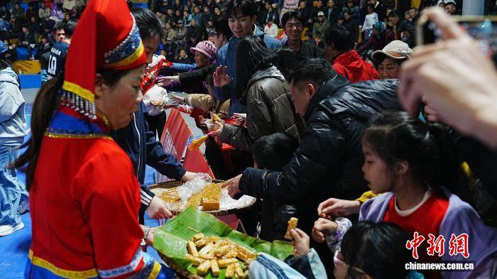 开幕式现场,科技元素与民族风情交织融合,无人机吊起的飞天屏在夜空中成为观众视线焦点,壮族芭蕉火龙舞、花式扣篮表演接棒,将现场气氛推向高潮。运动队伍及商家企业代表依次入场巡游,化身“乡村推介官”,带来本村特色农产品。一旁设置的乡土市集里,年粽、干货等农副产品琳琅满目,与巡游展示形成生动呼应,勾勒出一幅“篮球引领、产业助阵、文旅融合”的振兴画卷。